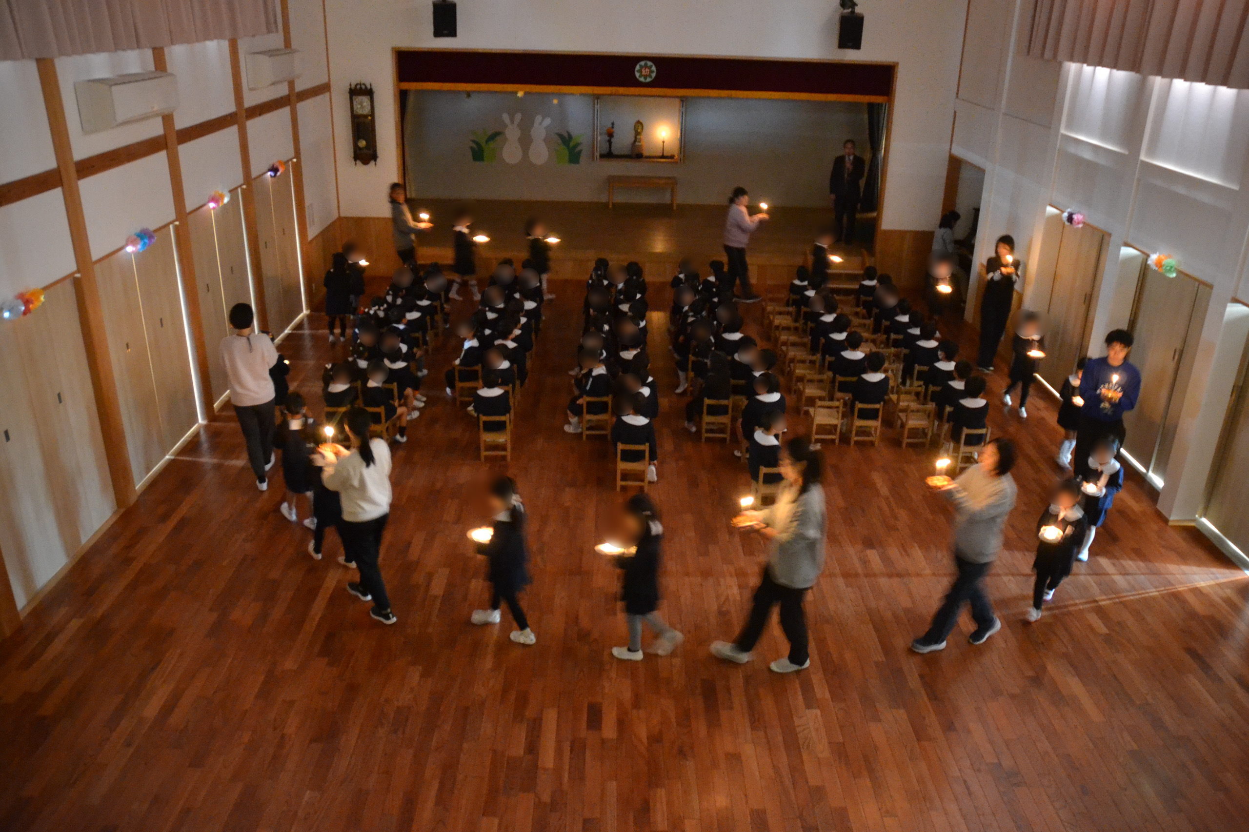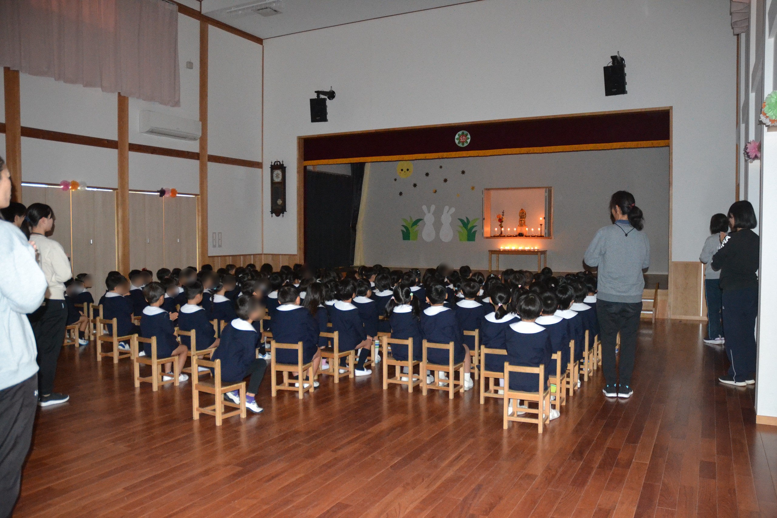 慶元寺幼稚園では成道会のお参りをし、年長組の代表のお友達がロウソクのお灯を持ってホールを歩きました。幻想的な空間の中で、「明るく、正しく、仲良く」の教えの大切さを改めて感じました。