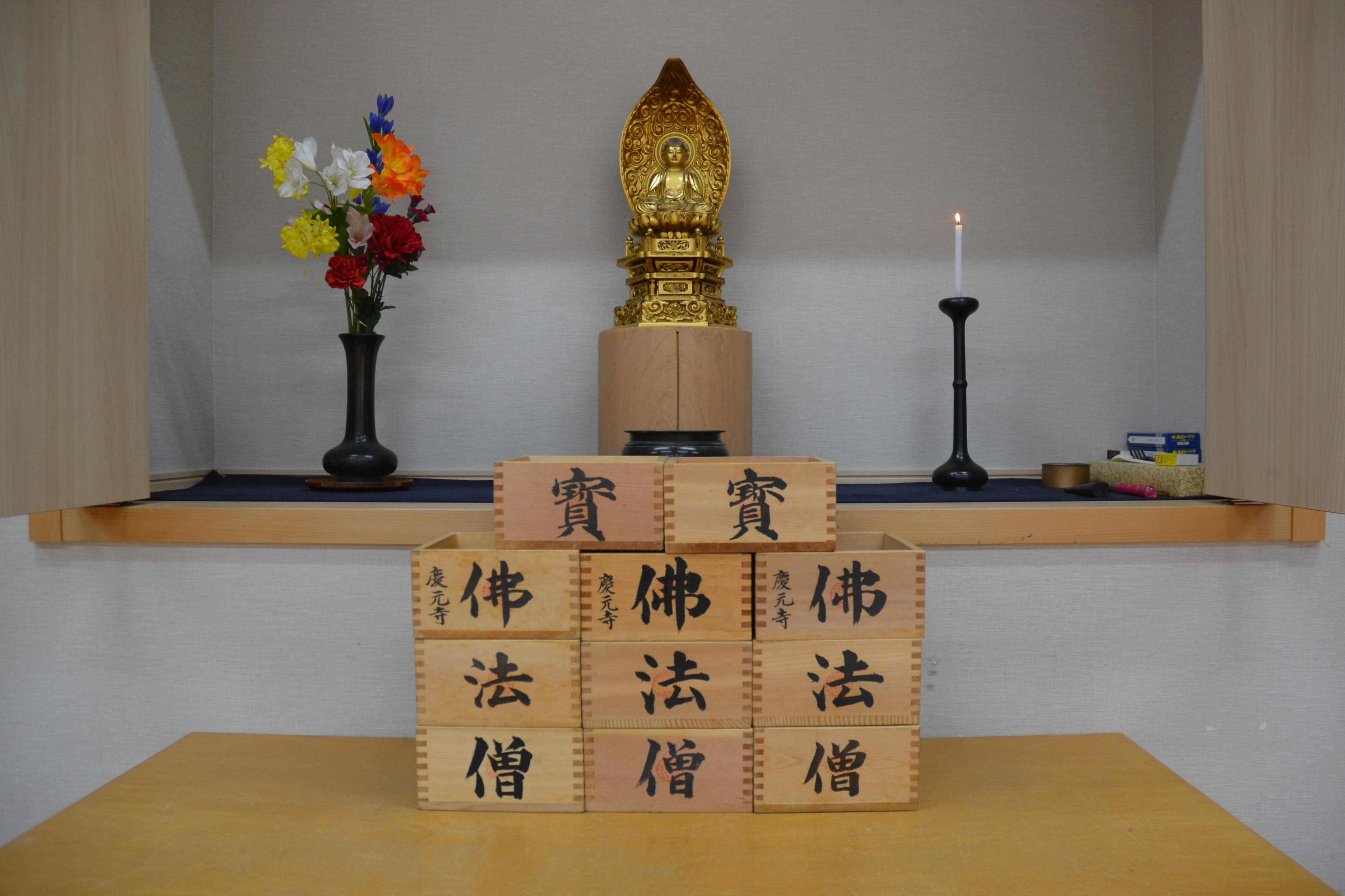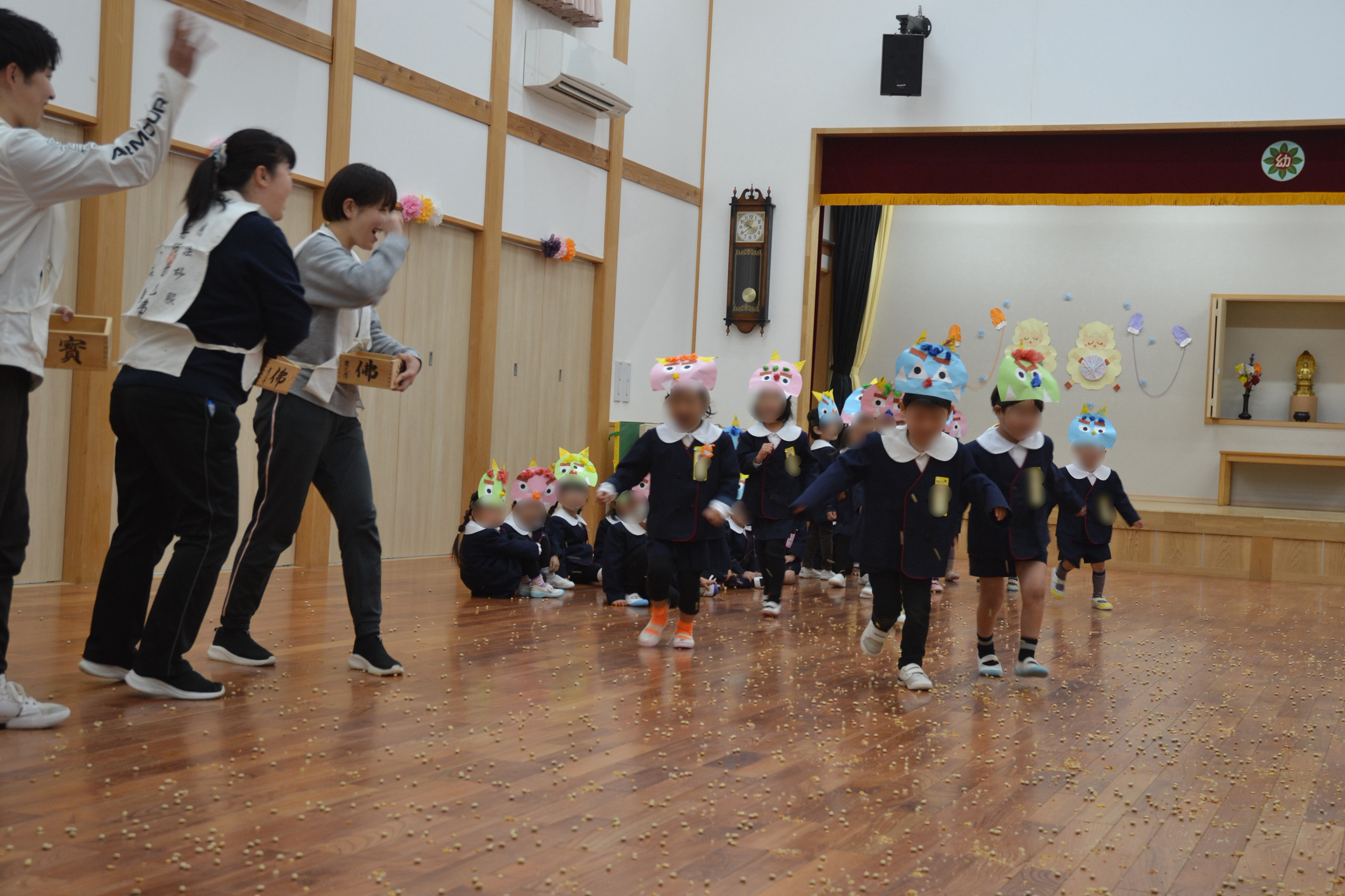 慶元寺幼稚園の節分では、鬼は皆さんの心の中にいるとお伝えしています。(怠け鬼やいじわる鬼、怒りんぼ鬼など…)この心の中の鬼を追い出し、沢山の「福」を招く為、先生たちが福の神となって福豆をまきました。
