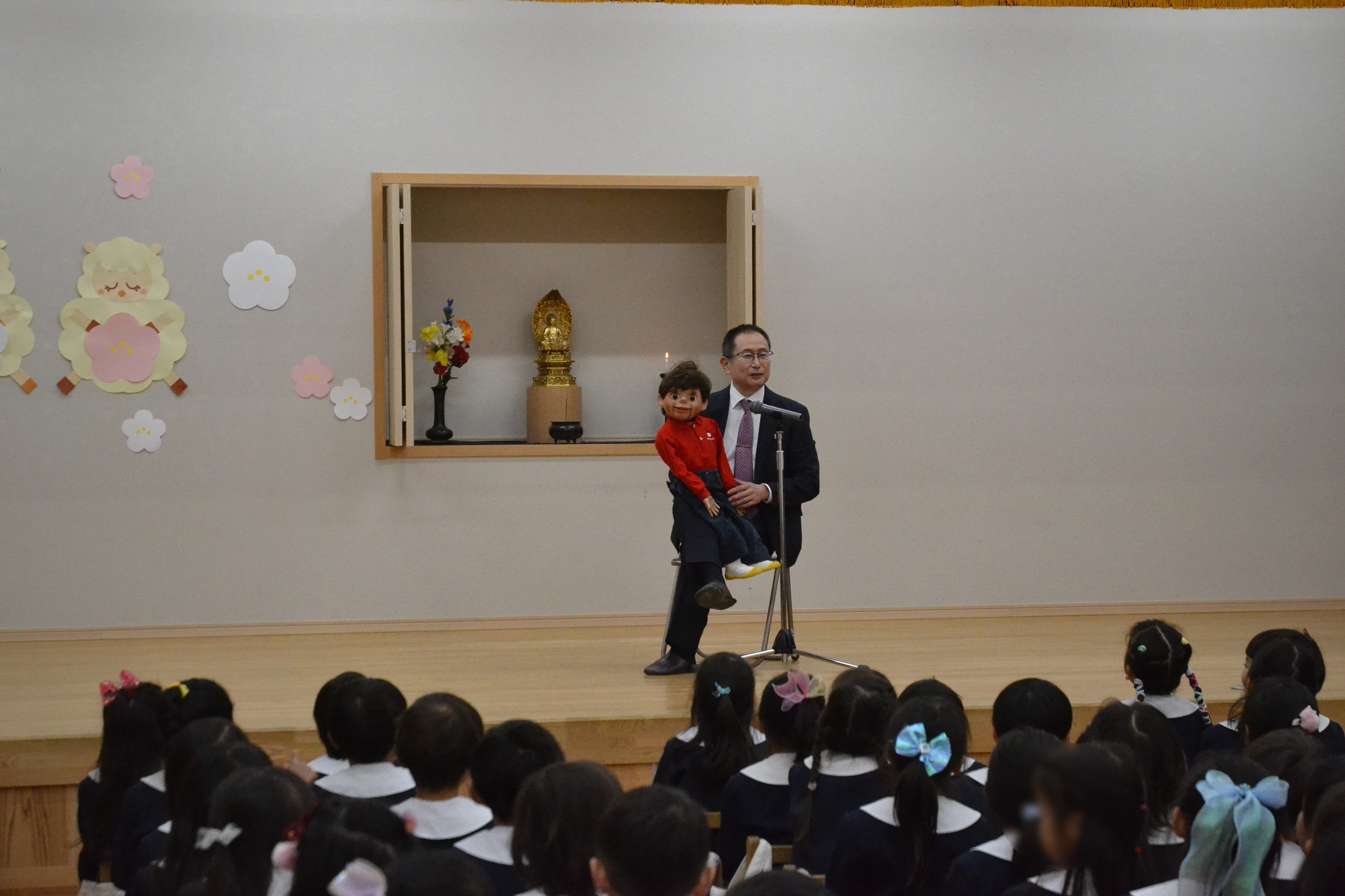 園長先生の腹話術や、3年間の馴染みのお歌やゲーム、先生たちの劇を楽しみました。